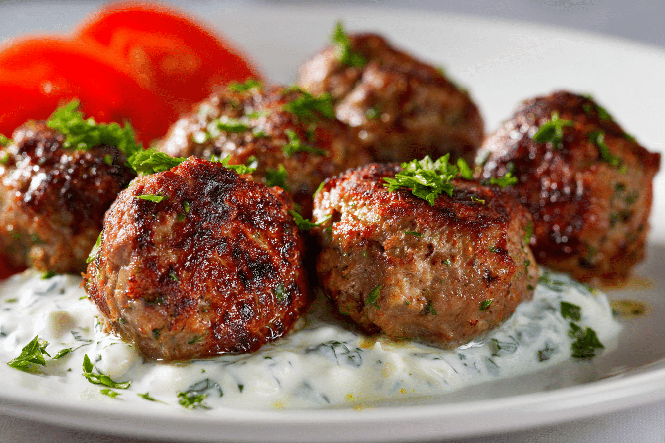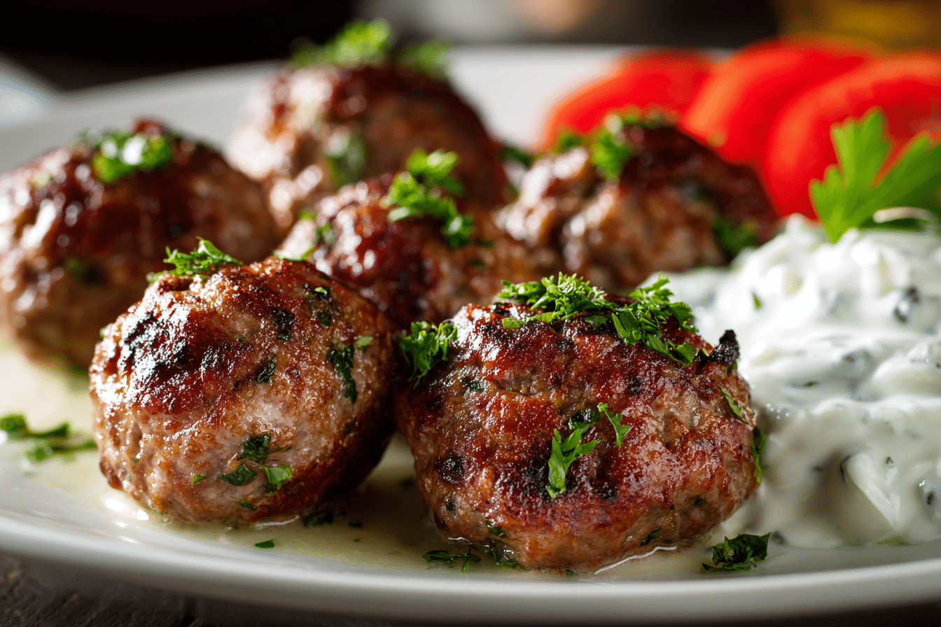 Once cooked, plate the meatballs warm with a generous dollop of chilled tzatziki. Garnish with fresh herbs, lemon wedges, or a drizzle of olive oil.