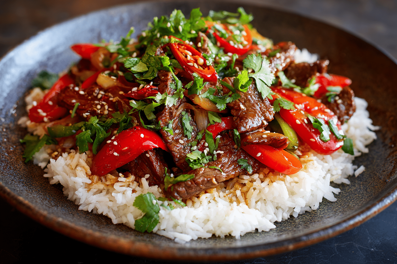 A flavorful and healthy rice bowl made with tender marinated beef, colorful bell peppers, and savory garlic-ginger sauce. Great for quick dinners or meal prep.