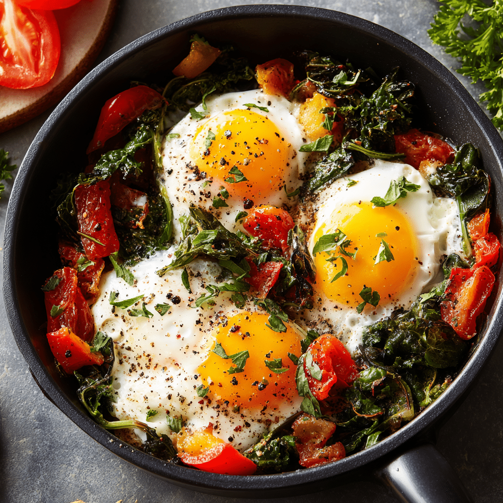 Add greens: Baby spinach, kale, or Swiss chard can be added before baking the eggs.