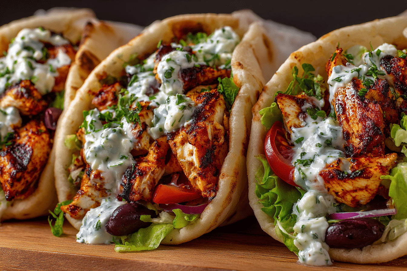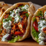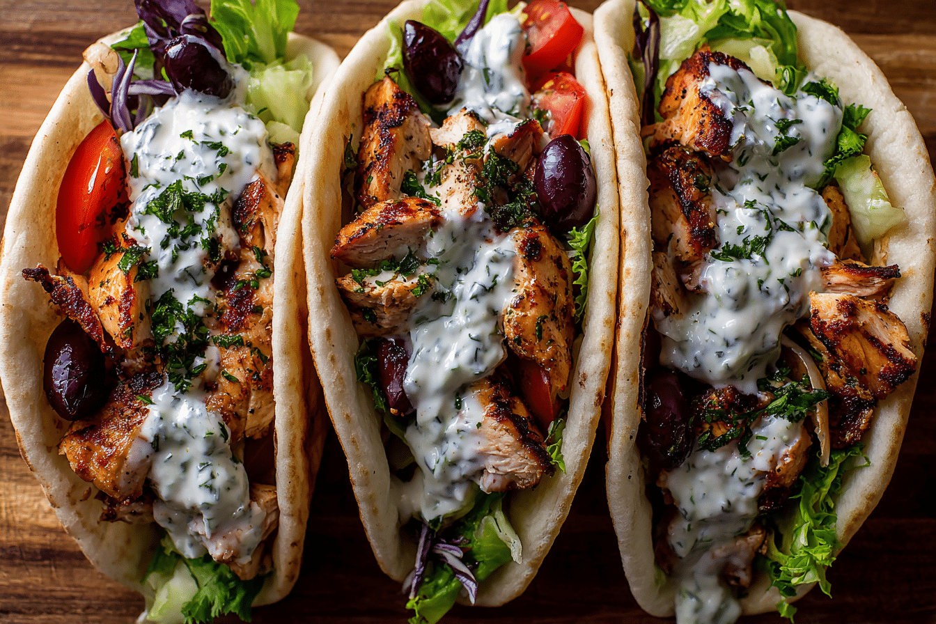 Juicy grilled chicken marinated in yogurt and herbs, served in warm pita with fresh veggies and creamy homemade tzatziki sauce — a Mediterranean street food favorite made easy at home.